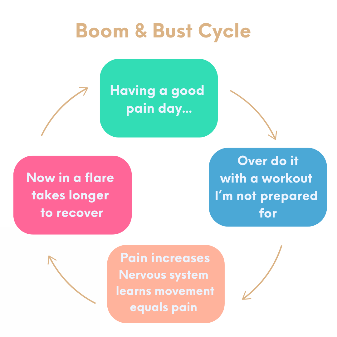 What I often see women do is BOOM & BUST. And this simply means do too much (BOOM) because they are so eager to feel strong again, but then this leaves them depleted and oftentimes in another flare (BUST). Pushing through the wrong exercise, or doing too much can contribute to more pain. Just like not challenging yourself enough can contribute to more pain, and then set you back. It’s all about finding the right balance for you.